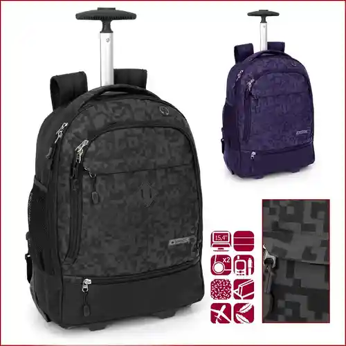 Ученическата раница Treck разполага с едно голямо основно отделение, едно отделение, предназначено за лаптоп, три джоба отпред, два странични джоба, телескопична дръжка и две колелца.