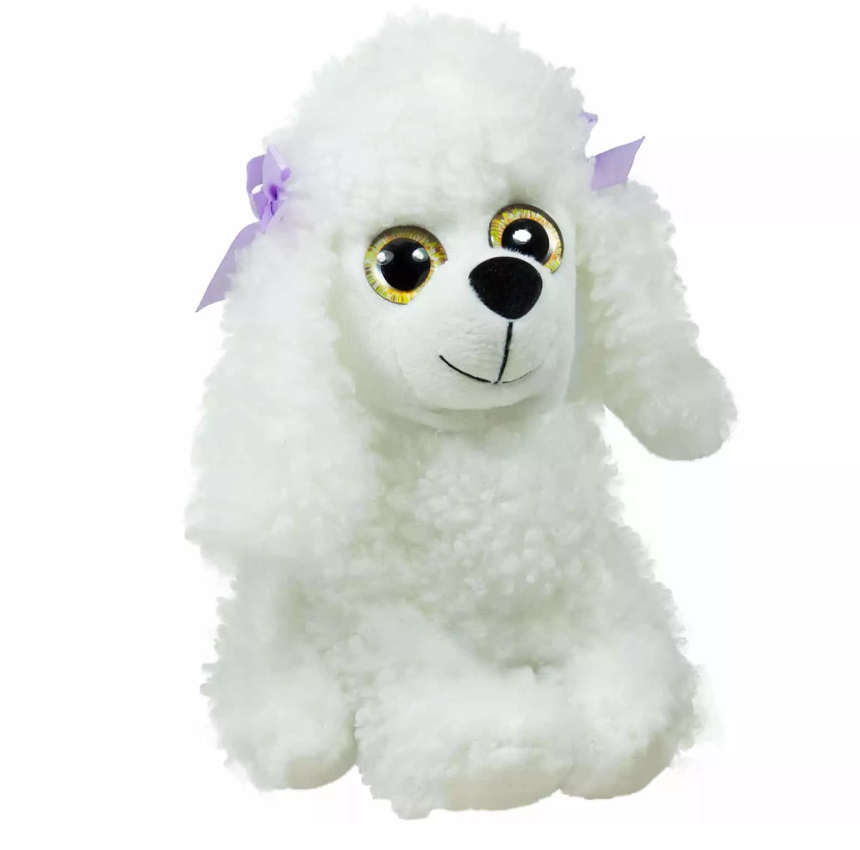 Изработена от висококачествен плюш. Плюшена играчка Куче Болонка бяла притежава и страхотни големи очи!