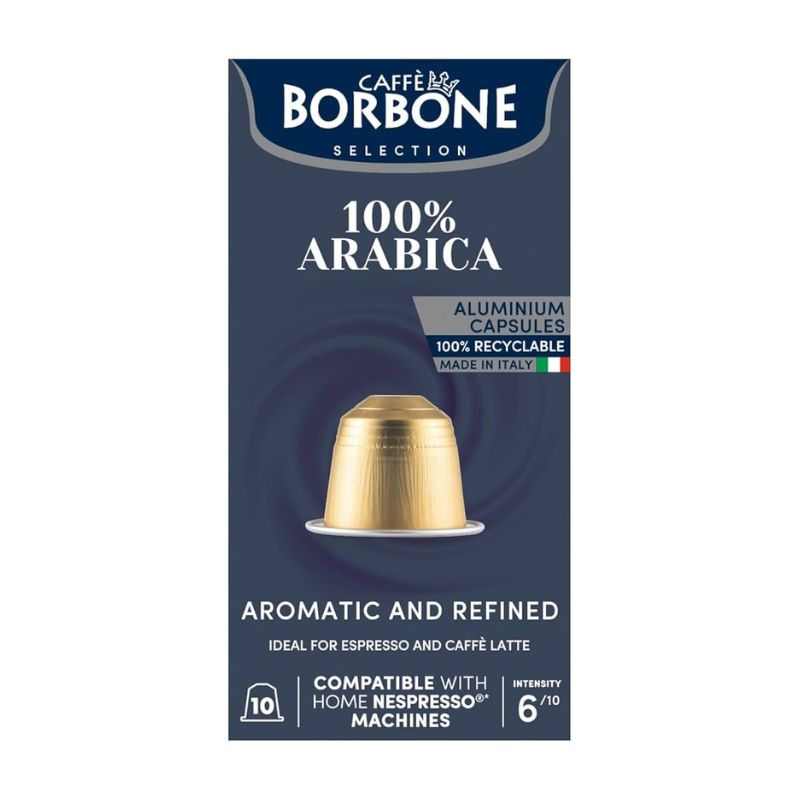 Подобрете рутината си на кафе с изключителния вкус и удобството на нашите 100% арабика капсули. Идеални за взискателните любители на кафето, които ценят изисканото еспресо, тези капсули носят първокласното качество на зърната арабика направо във вашата чаша. 100% арабика на зърна: изпитайте превъзходния вкус на 100% арабика кафе. Известни със своя мек, ароматен профил и нюансирани вкусове, нашите алуминиеви капсули за кафе ви осигуряват изтънчена и балансирана чаша еспресо с всяко варене. Съвместимо с оригинални машини Nespresso. Висококачествени алуминиеви капсули за кафе, обвити в първокласен алуминий за поддържане на свежестта и запазване на богатия аромат на кафето. Всяка капсула осигурява неизменно вкусно еспресо изживяване. Истинско италианско кафе: Родено в Неапол през 1998 г., Caffè Borbone е постоянен източник на иновации и вдъхновение, експериментирайки с нови технологии, за да донесе на света уникалния и безпогрешен вкус на неаполитанското кафе