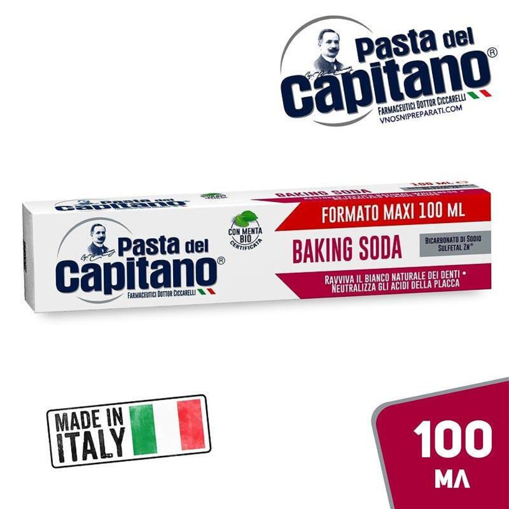 Pasta del Capitano Baking Soda е иновативна паста за зъби, която комбинира естествените свойства на сода бикарбонат и ментола, за да осигури ефективно почистване и освежаващ ефект.