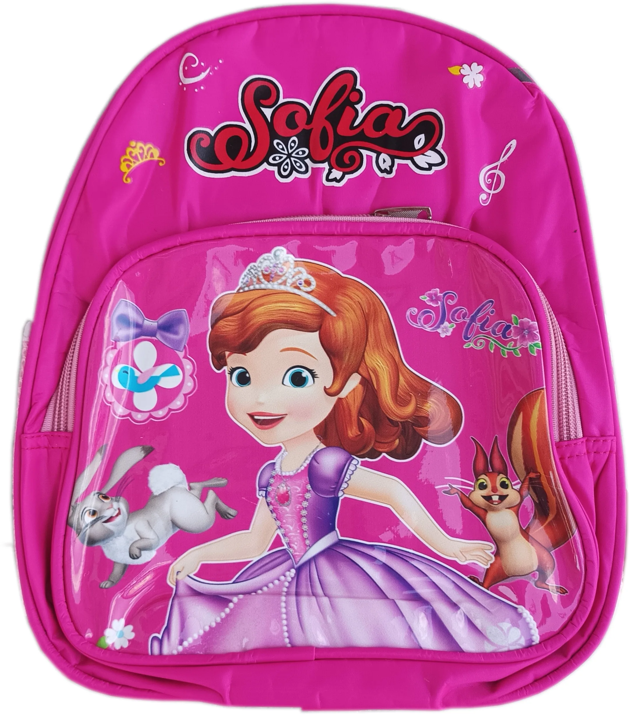 Раница за детска градина с картинка – София Sofia, розова е с мек гръб и презрамки. Раницата има един голям раздел, един преден джоб с цип и два странични.