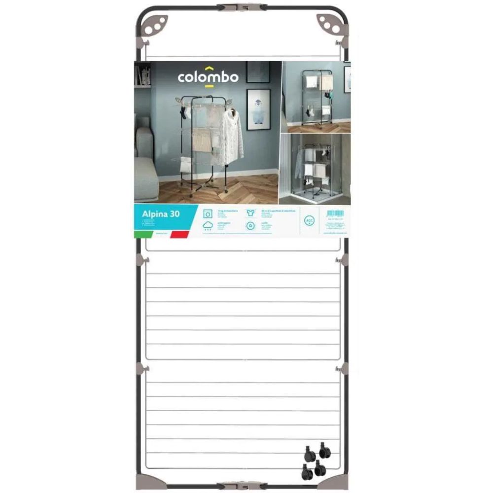 🧺 Colombo Alpina 30 – основни характеристики ✔️ Дължина на простор за дрехи: 30 м (за общо простиране) ✔️ Максимално натоварване: около 11 кг дрехи ✔️ Материал: покритa с боя стомана, против ръжда ✔️ Колела за преместване: Да, с въртящи се 360° анти‑надраскващи колелца ✔️ Антикорозионно покритие: Да ✔️ Произход: Италия (Made in Italy) 📏 Размери на сушилника В работно (отворено) положение: Височина: 125 cm Ширина: 68 cm Дълбочина: 68 cm В сгънато/компактно положение: Височина: 121 cm Ширина: 68 cm Дебелина (плосък): 4 cm Допълнителни детайли ✨ Има 3 нива/рафта за пробасяване на дрехи (може да се сложат закачалки) ✨ Пластмасови защити на краката предпазват подовете от надраскване ✨ Няма механизъм за предотвратяване на случайно сгъване (обикновен модел) ✨ Подходящ е както за вътре , така и за баня или тераса (не директно под дъжд)