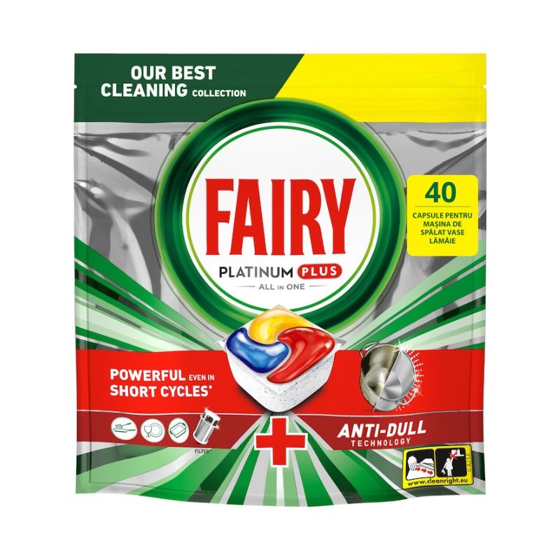 Таблетките за съдомиялна машина Fairy Platinum Plus „Всичко в едно“ осигуряват чистота като нови, дават ви най-доброто почистване на Fairy и дори помагат за премахване на матовостта, натрупана с времето, за да възстановят оригиналния блясък на вашите съдове. Fairy Platinum Plus има вградена система за предварително измиване, която извършва предварителното измиване вместо вас. С Fairy Platinum Plus няма нужда от предварително измиване, за да ви помогне да пестите вода и да бъдете по-екологични. Fairy комбинира течност и прах в една мощна капсула. Ултраразтворимата ѝ торбичка се разтваря бързо и работи добре в кратки цикли, тъй като започва почистването бързо, за да свърши работата. И са толкова лесни за употреба! Не е необходимо разопаковане, просто ги поставете в диспенсъра за препарат на вашата съдомиялна машина.