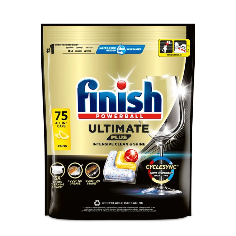 за 75 измивания Премахват дори втвърдената храна Мощно почистване Предпазват съдовете С аромат на лимон Finish Ultimate Plus All in 1 таблетки за съдомиялна предлагат интензивно почистване и перфектен блясък на Вашите съдове всеки път. Тези капсули, базирани на технологията CYCLECYNC, освобождават точните съставки в точното време по време на цикъла на измиване. Усъвършенстваната технология премахва дори втвърдената храна от съдовете, без необходимост от предварително изплакване, като действа в четири различни етапа по време на цикъла на измиване. Таблетките внимателно предпазват чашите и приборите, запазвайки техния блясък от миене до миене.
