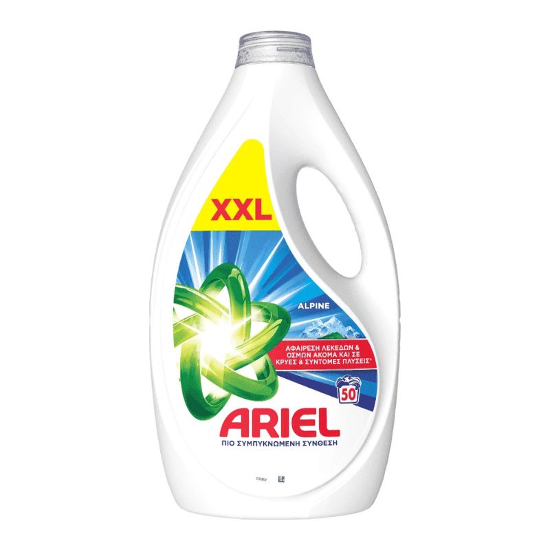 Течният перилен препарат Ariel Alpine предлага невероятна чистота още от първото пране, дори при 30°C. Формулата му е специално разработена за пране в студена вода и включва технология COLD BOOST. Течният перилен препарат Ariel също така предлага на дрехите ви дълготрайна алпийска свежест.