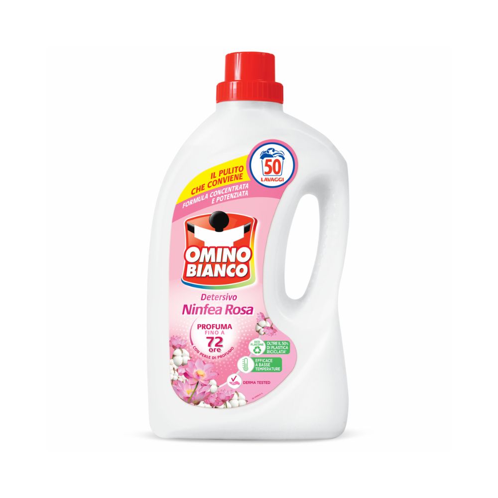 Препарат за пране Omino Bianco Ninfea ROSA е течен препарат за пералня с нова концентрирана формула, обогатен с ензими и аромат от розова водна лилия.