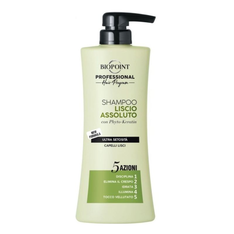 Шампоанът Absolute Smooth с 5 действия дава нова жизненост и благосъстояние на правата коса за професионален резултат директно у дома. Biopoint технологията с фито-кератин, термоактивни полимери и екстракт от бамбук с омекотяващи и хидратиращи свойства: Дисциплинира фибрата на косъма, като придава плавност и лекота; елиминира къдренето за дълготрайна права и подредена коса;  хидратира косата по цялата й дължина, без да я утежнява; озарява и контрастира скуката на косата в полза на винаги блестящо гладко покритие; кадифено, меко и копринено докосване от корените до краищата.